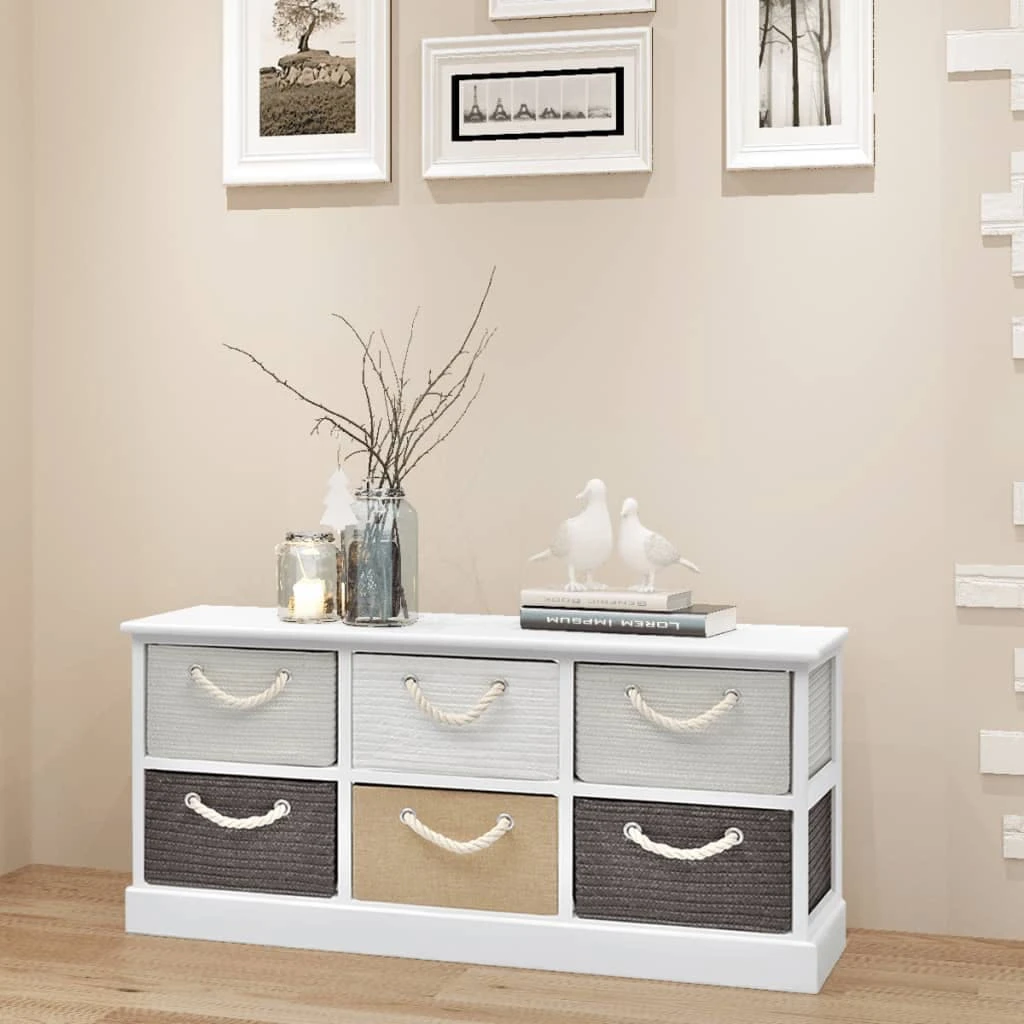 Die Bank hat sechs Schubladen die reichlich Platz für Ihre persönlichen Gegenstände liefern. Die Seil-Griffe der Schubladen verleihen der Kommode einen ländlichen Charakter.