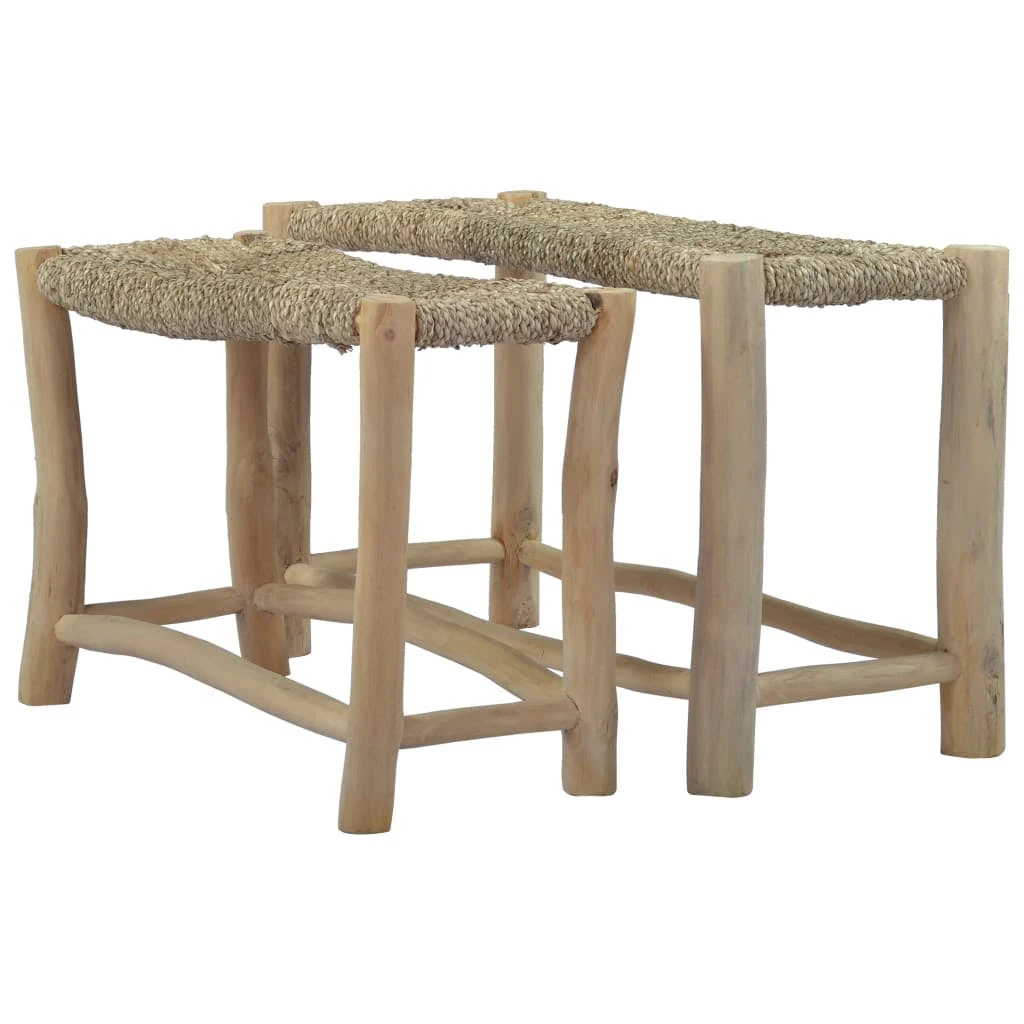 Verleihen Sie Ihrer Inneneinrichtung mit den stilvollen Teakholzbänken mit Seegrassitzen sofort einen Hauch von rustikalem Charme! Dieses aus extrem strapazierfähigem Teakholz gefertigte Möbelstück ist im Ofen getrocknet und anschließend fein geschliffen worden, um ein sehr glattes Erscheinungsbild zu erzielen. Teakholz ist bekannt für seine außergewöhnliche Festigkeit und Witterungsbeständigkeit. Zusätzlich haben die Bänke einen Sitz aus natürlichem Seegras, was sie sehr bequem macht. Natürliches Seegras hat einen subtilen Duft, der dem von Heu und anderen Grassorten ähnelt. Dieser Duft wird sich mit der Zeit auflösen. Wir empfehlen Ihnen, das Produkt mit Teaköl oder einem Finish auf Wasserbasis zu behandeln, um die Lebensdauer zu verlängern. Farbvariationen sind bei natürlichen Pflanzenfasern verständlich. Die Lieferung umfasst 2 Bänke.