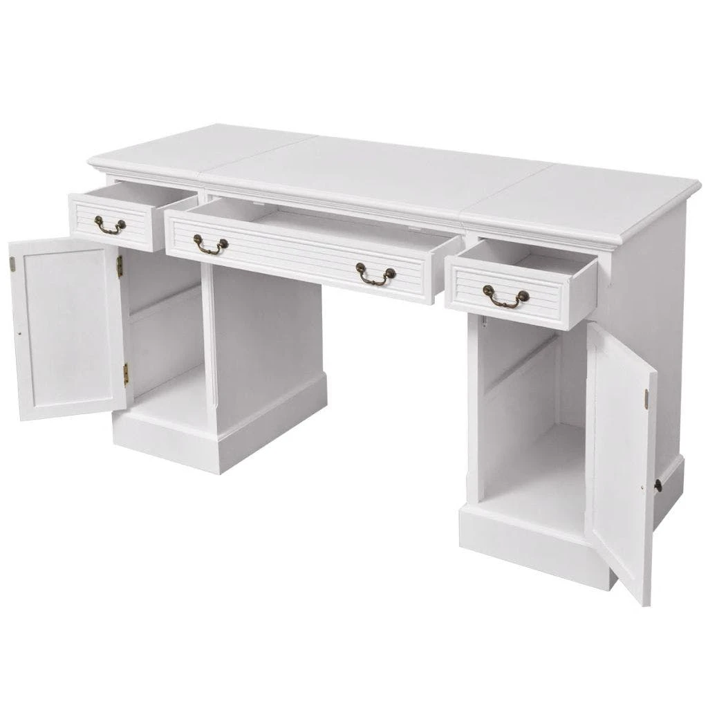 Dieser Sekretär überzeugt durch sein einfaches, dennoch elegantes Design und verleiht Ihrem Arbeits- oder Schlafzimmer eine romantische Note. Dieser Schreibtisch verfügt über drei Schubfächer für Papiere und Schreibutensilien sowie über zwei große Schrankfächer, die reichlich Platz für die Aufbewahrung und Organisation Ihrer Akten, Ordner und Dokumente bieten. Die geräumige Tischplatte bietet genügend Platz, um komfortabel zu arbeiten. Dieser langlebige und robuste Schreibtisch besteht aus hochwertigem MDF und Kiefernholz mit weißer Lackierung.